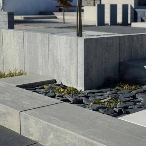 Palisady Legato wyróżniają się elegancką, uszlachetnioną powierzchnią licową oraz starannie wyprofilowanymi fazami krawędzi. Dzięki temu elementy te doskonale komponują się z nowoczesnymi nawierzchniami z kostki brukowej i płyt betonowych.